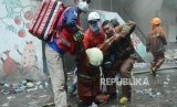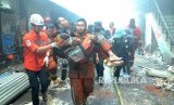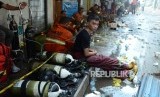 Seorang petugas kebakaran yang lemas dibawa ke luar lokasi kebakaran karena banyak mengirup asap dalam peristiwa kebakaran di Pasar Kosambi, Kota Bandung, Senin (20/1). (FOTO : Republika/Edi Yusuf)