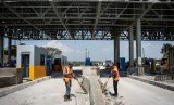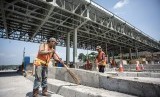 Pekerja beraktivitas dalam proyek pembangunan Gerbang Tol (GT) Kalihurip Utama di Cikampek, Karawang, Jawa Barat, Senin (20/5/2019). (FOTO : Antara/Aprillio Akbar)