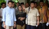 Pasangan Capres dan Cawapres No 02 Prabowo Subianto-Sandiaga Uno menyapa usai memberikan keterangan terkait hasil final rekapitulasi nasional KPU di Kertanegara, Jakarta, Selasa (21/5). (FOTO : Republika/Prayogi)