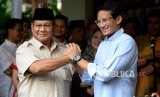 Pasangan Capres dan Cawapres No 02 Prabowo Subianto-Sandiaga Uno berjabat tangan usai memberikan keterangan terkait hasil final rekapitulasi nasional KPU di Kertanegara, Jakarta, Selasa (21/5). (FOTO : Republika/Prayogi)