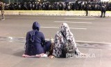 Peserta unjuk rasa melepas lelah di sekitar kawasan Bundaran HI setelah aksi di depan Bawaslu berakhir, Selasa (21/5). (FOTO : Yogi Ardhi/Republika)