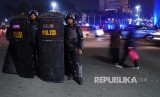 Polisi bertameng berjaga di sekitar Bundaran HI melokalisir konsentrasi massa pasca unjuk rasa di Gedung Bawaslu RI, Jakarta, Selasa (21/5). (FOTO : Yogi Ardhi/Republika)