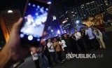 Sejumlah karyawan perkantoran di sekitar Bundaran HI memanfaatkan suasana lengang jalanan untuk berfoto pasca unjuk rasa di Gedung Bawaslu RI, Jakarta, Selasa (21/5). (FOTO : Yogi Ardhi/Republika)