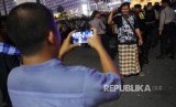 Warga memanfaatkan barisan polisi sabagai latar fotonya di sekitar Bundaran HI pasca unjuk rasa di Gedung Bawaslu RI, Jakarta, Selasa (21/5). (FOTO : Yogi Ardhi/Republika)