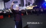Warga negara asing yang melintasi pun memanfaatkan barisan pengamanan sebagai latar swafoto di Bundaran HI, Jakarta, Selasa (21/5) (FOTO : Yogi Ardhi/Republika)