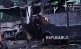 Bangkai bus Brimob yang terbakar di area Kompleks Asrama Brimob Petamburan, Jakarta, Rabu (22/5). (FOTO : Yogi Ardhi/Republika)