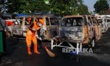 Petugas Dinas kebersihan menyapu serpihan bangkai mobil yang terbakar di area Kompleks Asrama Brimob Petamburan, Jakarta, Rabu (22/5). (FOTO : Yogi Ardhi/Republika)