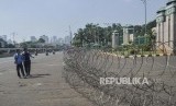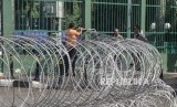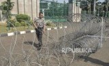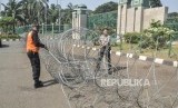 REPUBLIKA.CO.ID, JAKARTA -- Suasana gerbang gedung DPR/MPR yang dipasangi kawat berduri di Senayan, Jakarta Pusat, Rabu (22/5).