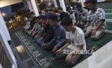 Sejumlah peserta melaksanakan ibadah salat maghrib pada kegiatan Pesantren Jurnalistik Republika di Kampung Pa'go, Kabupaten Bandung, Jumat (24/5). (FOTO : Republika)