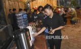 Sejumlah peserta mengantre untuk mengambil takjil pada kegiatan Pesantren Jurnalistik Republika di Kampung Pa'go, Kabupaten Bandung, Jumat (24/5). (FOTO : Republika)
