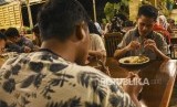 Sejumlah peserta menyantap makanan pada kegiatan Pesantren Jurnalistik Republika di Kampung Pa'go, Kabupaten Bandung, Jumat (24/5). (FOTO : Republika)