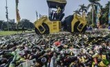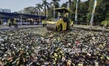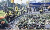 REPUBLIKA.CO.ID, JAKARTA -- Sejumlah petugas gabungan saat memusnahkan minuman keras (miras) menggunakan alat berat di Lapangan Monas, Jakarta Pusat, Senin (27/5).