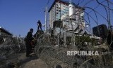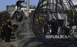 Aparat Kepolisian merapikan kembali kawat berduri yang terpasang di kawasan Gedung Bawaslu, Jalan MH Thamrin, Jakarta, Senin (27/5/2019). (FOTO : Antara/Puspa Perwitasari)