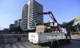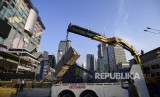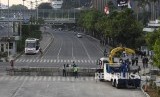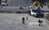 Petugas Dinas Perhubungan mengangkut beton pembatas jalan di kawasan Gedung Bawaslu, Jalan MH Thamrin, Jakarta, Senin (27/5/2019). (FOTO : Antara/Puspa Perwitasari)