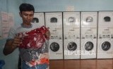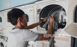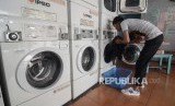 REPUBLIKA.CO.ID, JAKARTA -- Jasa Laundry Kiloan usai Libur Lebaran. Pekerja menyuci baju konsumen dengan mesin di Jalan Jaksa, Jakarta Pusat, Senin (10/6).