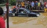 Sebuah mobil berusaha melintasi banjir luapan Sungai Pohara di Desa Andadowi, Konawe, Sulawesi Tenggara, Selasa (11/6/2019). (FOTO : Antara/Jojon)