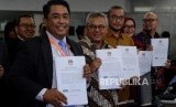 Ketua KPU Arief Budiman bersama sejumlah Komisioner KPU saat akan menyerahkan alat bukti KPU dalam Perselisihan Hasil Pemilihan Umum (PHPU) Pemilihan Presiden 2019, di Mahkamah Konstitusi (MK), Jakarta, Rabu (12/6). (FOTO : Republika/Putra M. Akbar)