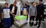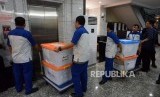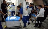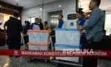 Petugas menurunkan alat bukti KPU dalam Perselisihan Hasil Pemilihan Umum (PHPU) untuk Pemilihan Presiden 2019 di Mahkamah Konstitusi (MK), Jakarta, Rabu (12/6). (FOTO : Republika/Putra M. Akbar)
