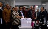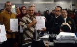 Ketua KPU Arief Budiman bersama sejumlah Komisioner KPU saat menyerahkan alat bukti KPU dalam Perselisihan Hasil Pemilihan Umum (PHPU) Pemilihan Presiden 2019, di Mahkamah Konstitusi (MK), Jakarta, Rabu (12/6). (FOTO : Republika/Putra M. Akbar)