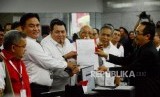 REPUBLIKA.CO.ID, JAKARTA -- Ketua Tim Hukum TKN Yusril Ihza Mahendra bersama Direktur Hukum dan Advokasi TKN Ade Irfan Pulungan saat menyerahkan jawaban terkait sengketa Pemilihan Presiden 2019 di Mahkamah Konstitusi, Jakarta, Kamis (13/6).
