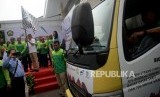 Menteri ESDM Ignasius Jonan mengakat bendera sebagai tanda peluncuran uji jalan Penggunaan Bahan Bakar B30 untuk kendaraan bermesin diesel di Kementerian ESDM, Jakarta, Kamis (13/6). (FOTO : Republika/Prayogi)