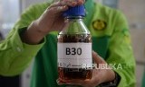 REPUBLIKA.CO.ID, JAKARTA -- Petugas menunjukkan sampel bahan bakar B-30 saat peluncuran uji jalan Penggunaan Bahan Bakar B-30 untuk kendaraan bermesin diesel di halaman Kementerian ESDM, Jakarta, Kamis (13/6/2019).