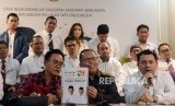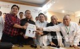 Ketua Tim Kuasa Hukum Calon Presiden dan Wakil Presiden Nomor Urut 01 Joko Widodo-Ma'ruf Amin, Yusril Ihza Mahendra (kiri) bersama Wakil Ketua TKN Asrul Sani (kedua kiri) dan Direktur Hukum dan Advokasi TKN Ade Irfan Pulungan (tengah) menunjukan berkas perbaikan keterangan usai konferensi pers di Jakarta, Senin (17/6). (FOTO : Republika/Putra M. Akbar)