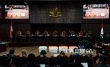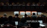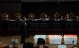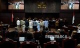 Hakim Mahkamah Konstitusi memperlihatkan sejumlah barang bukti pihak pemohon yang belum bisa diverifikai pada sidang lanjutan Perselisihan Hasil Pemilihan Umum (PHPU) Pemilihan Presiden (Pilpres) 2019 di Gedung Mahkamah Konstitusi, Jakarta, Rabu (19/6). (FOTO : Republika/Putra M. Akbar)