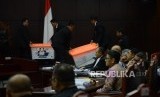 Hakim Mahkamah Konstitusi memperlihatkan sejumlah barang bukti pihak pemohon yang belum bisa diverifikasi kepada Tim Kuasa Hukum Prabowo-Sandi, Bambang Widjojanto pada sidang lanjutan Perselisihan Hasil Pemilihan Umum (PHPU) Pemilihan Presiden (Pilpres) 2019 di Gedung Mahkamah Konstitusi, Jakarta, Rabu (19/6). (FOTO : Republika/Putra M. Akbar)