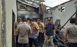 Petugas kepolisian melakukan identifikasi lokasi kebakaran pabrik korek api di Desa Sambirejo Kecamatan Binjai Kabupaten Langkat, Sumatera Utara, Jumat (21/6/2019). (FOTO : Antara/HO)