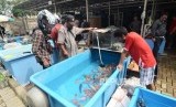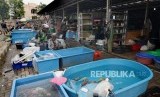 REPUBLIKA.CO.ID, JAKARTA -- Pedagang membersihkan kolam penampungan ikan di bursa pasar hewan kawasan di Jatinegara, Jakarta Pusat, Senin (24/6).