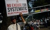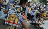 Sejumlah massa membentangkan poster pada Aksi Tahlil Akbar 266 di Jalan Medan Merdeka Barat, Jakarta, Rabu (26/6). (FOTO : Republika/Putra M. Akbar)