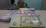 Seorang pegawai Bank Mandiri Syariah memperlihatkan uang Saudi Arabian Riyal (SAR) di Bank Mandiri Syariah Jakarta, Kamis (27/6). (FOTO : darmawan / republika)