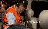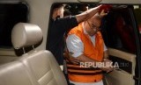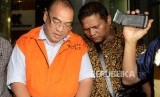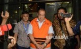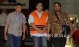 Asisten Bidang Tindak Pidana Umum (Aspidum) Kejaksaan Tinggi DKI Jakarta Agus Winoto mengenakan rompi oranye usai melakukan pemeriksaan di Gedung KPK, Jakarta, Sabtu (29/6). (FOTO : Republika/Putra M. Akbar)