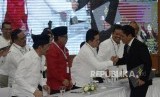 Penetapan Presiden dan Wakil Presdien Terpilih. Ketua TKN Erick Thohir bersalaman dengan Anggota Direktorat Advokasi dan Hukum BPN Habiburokhman pada acara penyerahan surat keputusan KPU tentang Penetapan Hasil Pemilu 2019 kepada Presiden dan Wakil Presiden terpilih Periode 2019-2024 di Gedung KPU, Jakarta, Ahad (30/6). (FOTO : Republika/Putra M. Akbar)