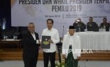 REPUBLIKA.CO.ID, JAKARTA -- Ketua KPU Arief Budiman menyerahkan surat keputusan KPU tentang Penetapan Hasil Pemilu 2019 kepada Presiden dan Wakil Presiden terpilih Periode 2019-2024, Joko Widodo dan KH Ma'ruf Amin di Gedung KPU, Jakarta, Ahad (30/6).