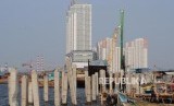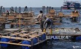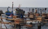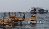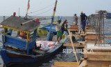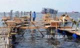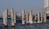 REPUBLIKA.CO.ID, JAKARTA -- Sejumlah pekerja menyelesaikan pondasi dermaga di Muara Angke, Jakarta Utara, Senin (1/7).
