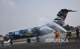 Petugas gabungan berusaha memadamkan api saat simulasi penanggulangan kecelakaan pesawat di Pangkalan Udara Husein Sastranegara, Kota Bandung, Kamis (4/7). (FOTO : Abdan Syakura)
