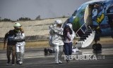 Petugas gabungan mengevakuasi penumpang beserta kru pesawat saat simulasi penanggulangan kecelakaan pesawat di Pangkalan Udara Husein Sastranegara, Kota Bandung, Kamis (4/7). (FOTO : Abdan Syakura)