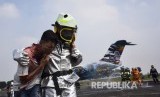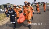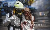 REPUBLIKA.CO.ID, BANDUNG -- Petugas gabungan berusaha menangani pesawat dan mengevakuasi penumpang beserta kru pesawat saat simulasi penanggulangan kecelakaan pesawat, di Pangkalan Udara Husein Sastranegara, Kota Bandung, Kamis (4/7).
