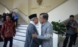 Wakil Presiden Jusuf Kalla berjabat tangan dengan Wakil Presiden terpilih KH Ma'ruf Amin sebelum melakukan pertemuan di Kantor Wapres, Jakarta, Kamis (4/7). (FOTO : Republika/Prayogi)
