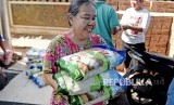 Warga membawa beras yang dibeli di Ruang Publik Terbuka Ramah Anak (RPTRA) Taman Keuangan, Bendungan Hilir, Tanah Abang, Jakarta, Jumat (12/7/2019). (FOTO : Antara/M Risyal Hidayat)