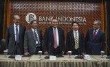 Gubernur Bank Indonesia (BI) Perry Warjiyo (tengah) berbincang bersama Senior Deputi BI Mirza Adityaswara (kedua kanan) dan jajaran Deputi BI Sugeng (kanan), Erwin Rijanto (kedua kiri) serta Dody Budi Waluyo (kiri) sebelum mengumumkan hasil Rapat Dewan Gubernur (RDG) BI di gedung BI, Jakarta, Kamis (18/7/2019). (FOTO : Antara/Muhammad Adimaja)
