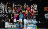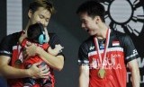Ganda putra Indonesia Marcus Fernaldi Gideon (kiri) dan Kevin Sanjaya Sukamuljo berada di atas podium setelah bertanding mengalahkan ganda putra Indonesia Mohammad Ahsan dan Hendra Setiawan pada final Blibli Indonesia Open 2019 di Istora Gelora Bung Karno, Jakarta, Ahad (21/7). (FOTO : Republika/Edwin Dwi Putranto)