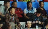 Pelatih ganda putra Indonesia Herry IP (kedua kanan atas) duduk di tribun stadion saat menyaksikan partai final nomor ganda putra antara Marcus Fernaldi Gideon/Kevin Sanjaya Sukamuljo melawan Mohammad Ahsan/Hendra Setiawan pada Blibli Indonesia Open 2019 di Istora Gelora Bung Karno, Jakarta, Ahad (21/7). (FOTO : Republika/Edwin Dwi Putranto)