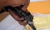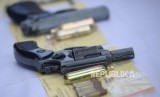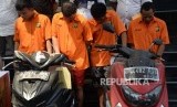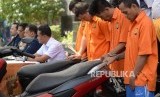 REPUBLIKA.CO.ID, JAKARTA -- Polisi menunjukan tersangka dan barang bukti kasus pencurian dengan pemberatan dan kepemilikan senjata air soft gun tanpa izin serta kasus penipuan dan pemalsuan saat jumpa pers di Polda Metro Jaya, Selasa (23/7).