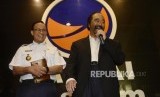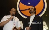 Ketua Umum Partai NasDem, Surya Paloh dan Gubernur DKI Jakarta, Anies Baswedan memberikan keterangan kepada wartawan usai menggelar pertemuan di Kantor DPP NasDem, Jakarta, Rabu (24/7). (FOTO : Republika/Putra M. Akbar)