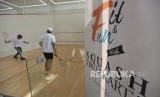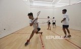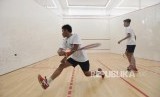 Dua orang warga bermain squash di Lapangan Squash Gelora Bung Karno, Jakarta, Sabtu (27/7). (FOTO : Republika/Edwin Dwi Putranto)