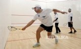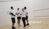 Direktur Utama PT Garuda Indonesia (persero) Tbk Ari Ashkara bermain squash bersama atlet nasional Aristia Prima dan Catur Yuliana di Lapangan Squash Gelora Bung Karno, Jakarta, Sabtu (27/7). (FOTO : Republika/Edwin Dwi Putranto)