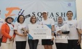 Direktur Utama PT Garuda Indonesia (persero) Tbk Ari Ashkara (ketiga kanan) bersama Ketua Persatuan Squash Indonesia DKI Jakarta Amalia Chrisna Damayanti (keempat kanan) saat seremoni pemberian bantuan pengembangan squash di Lapangan Squash Gelora Bung Karno, Jakarta, Sabtu (27/7). (FOTO : Republika/Edwin Dwi Putranto)